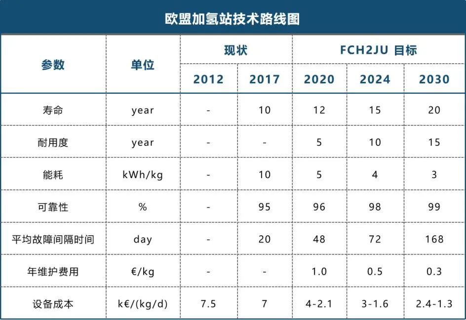 国际上,美国、日本、欧洲等国家在加氢站技术开发方面起步较早,90%以上加氢站具有 70MPa 加氢能力,以液氢储存的大容量加氢站日加氢量可超过 2000kg,加氢站全负荷、高可靠运行技术持续进步,支撑氢能基础设施全周期成本逐步降低。美国、欧盟以及日本加氢站发展路线图如下: