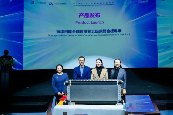 在“成果发布”环节,氢璞创能成为全场焦点,全球首发了额定功率600kW,最大设计功率1MW的碳复合板电堆。这款产品的成功问世,标志着我国燃料电池技术正式迈入“单堆兆瓦”新时代。同时也标志着氢璞大功率电堆在流体分布、结构封装和极致工艺上均取得了重大突破。氢璞创能研发副总朱俊娥在发布会现场介绍“该款电堆基于国家‘十四五’重大研发专项布局,设计单电池数量达1000组、单堆功率1MW、体积功率密度达行业顶尖水平,该产品解决了千吨级船舶、轨道交通、百兆瓦级固定发电等领域对大功率单堆的迫切需求,告别了以往依赖多堆并联带来的系统复杂、控制难、成本高、体积大等痛点”。