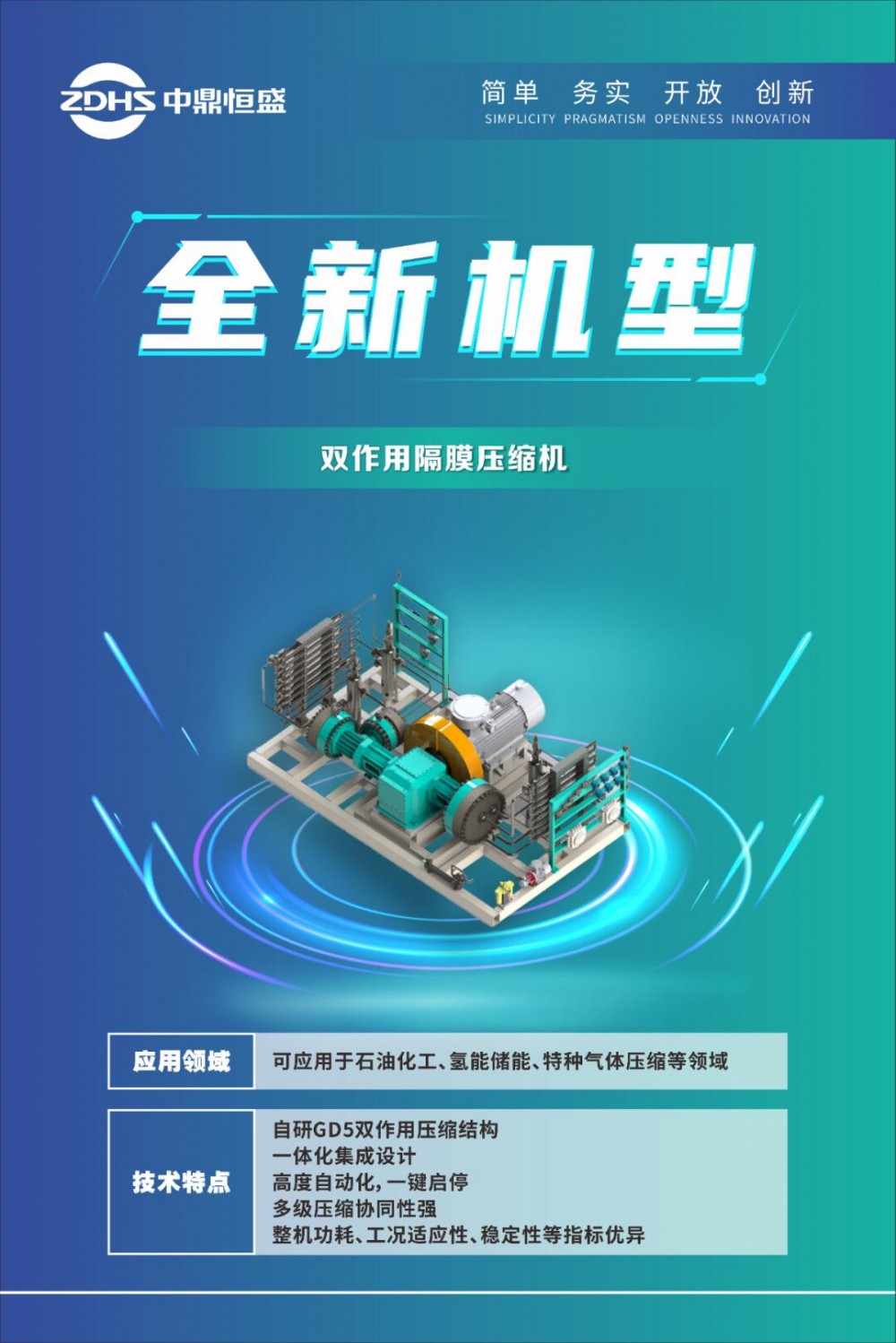 中鼎恒盛双作用GD5隔膜压缩机的诞生,并非简单的产品升级,而是针对隔膜压缩机在高压氢气应用领域长期存在的“系统冗余、效率受限、空间占用大”等核心痛点,提供的一项系统性解决方案,是缩机技术向更高效、更紧凑、更智能方向演进的重要里程碑。未来,中鼎恒盛将以技术创新为引擎,持续推动高端装备国产化进程,为氢能等新能源产业发展注入强劲动力。