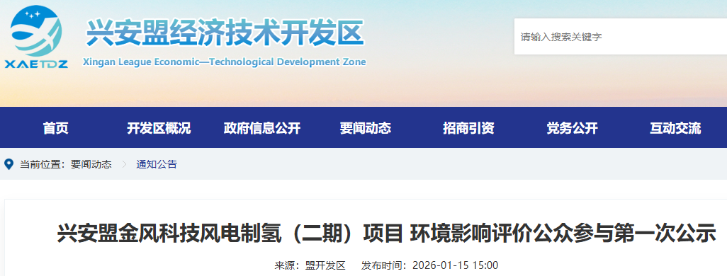 1月15日,兴安盟金风科技风电制氢(二期)项目环境影响评价公众参与第一次公示。