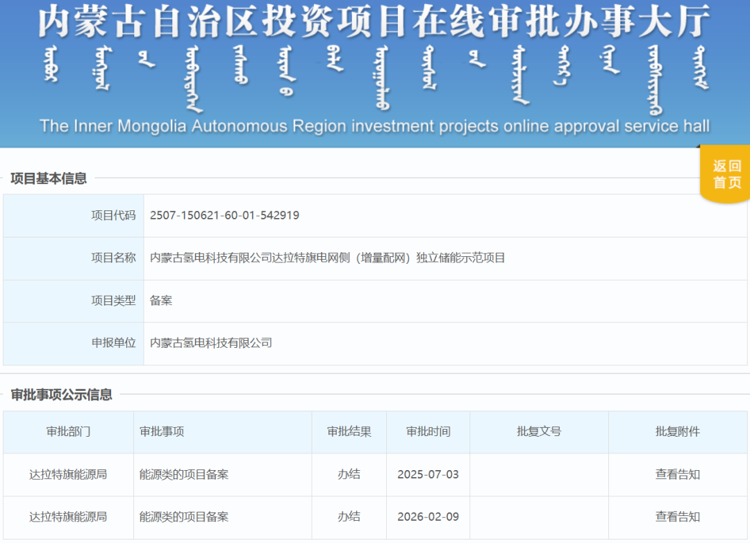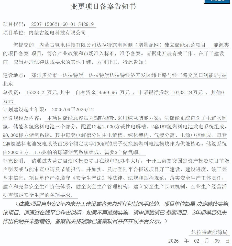 近日,内蒙古氢电科技有限公司达拉特旗电网侧(增量配网)独立储能示范项目变更获批。