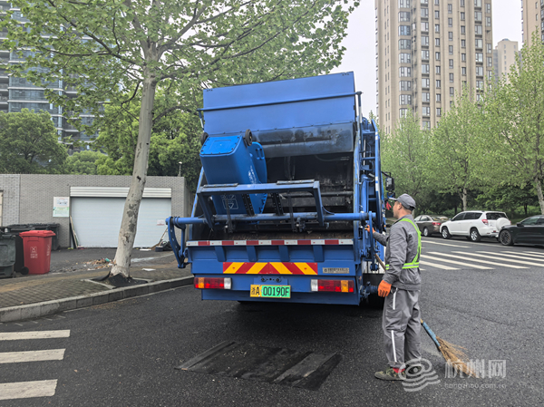 4月20日上午10点,一辆挂着绿色新能源牌照的5吨清运车缓缓驶入上城区富春路,驾驶员马忠元和搭档张洪亮刚刚完成钱塘印象小区的清
