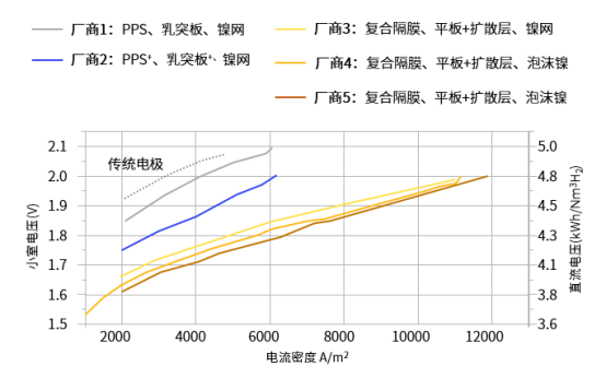 部分碱性电解槽厂商已开始致力于提高电密并取得一定的成绩,但距离PEM槽万安级电密仍有相当距离。