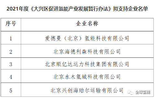 12月5日,北京大兴区人民政府发布了2021年度《大兴区促进氢能产业发展暂行办法》拟支持企业名单公示的通知。爱德曼(北京) 氢能科技有限公司、北京海德利森科技有限公司、北京顺亿达运力科技集团有限公司、北京水木氢城科技有限公司和北京兴创海珀尔运输有限公司上榜。