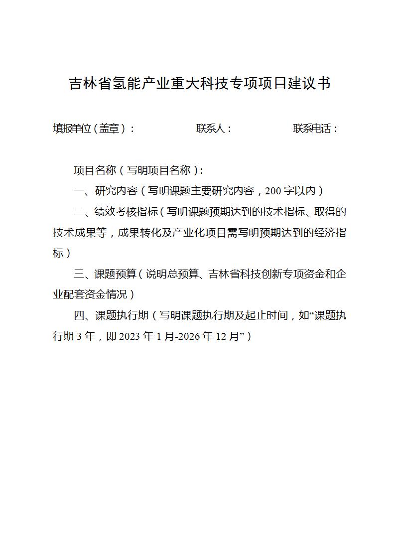 2024年7月16日,吉林省科技厅发布关于公开征集吉林省氢能产业重大科技专项项目建议的通知。该通知明确指出:1、征集对象:省内从