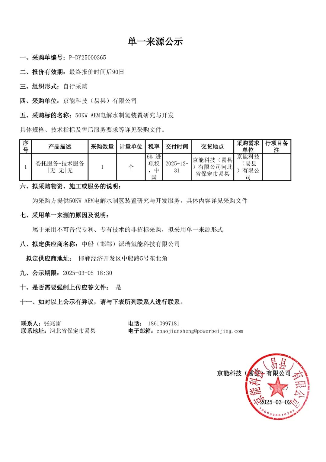 10月9日,京能科技(易县)有限公司AEM水电解制氢项目工程总承包采购公告发布。