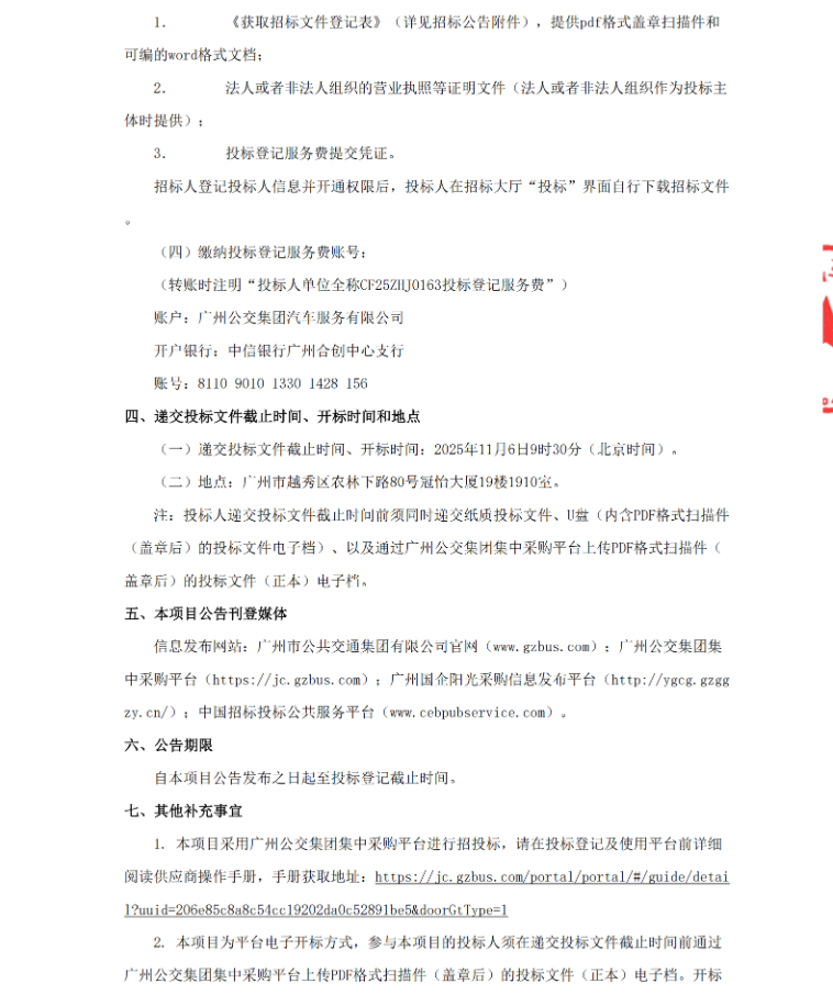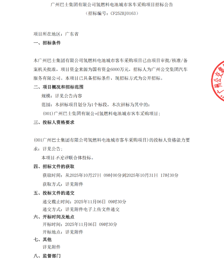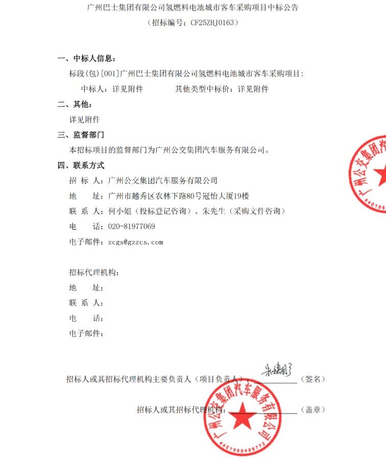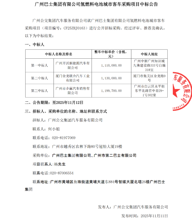 11月11日,广州巴士集团有限公司氢燃料电池城市客车采购项目中标公告。