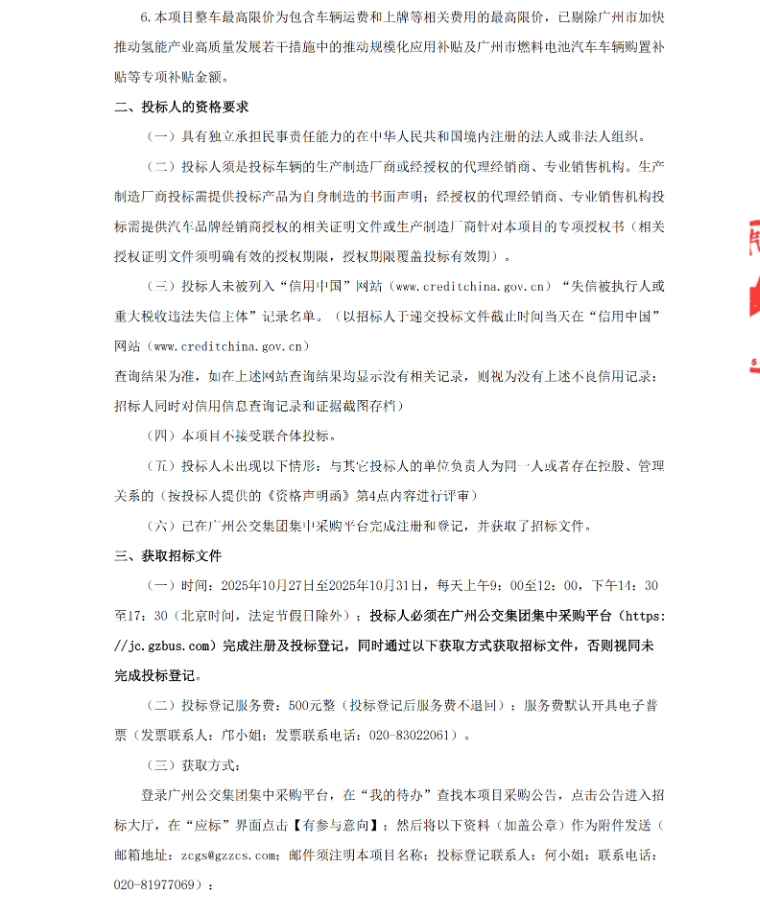 根据招标公告,采购单位为广州巴士集团有限公司、广州市第二巴士有限公司。计划采购50辆8.4~8.599米氢燃料电池城市客车。整车最高单价限价为120万元/辆(含税),最高总限价6000万元(含税)。