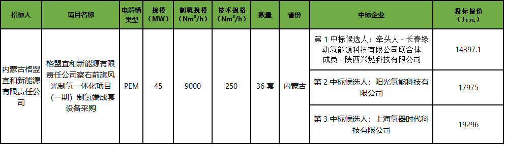 12月25日,格盟宜和新能源有限责任公司察右前旗风光制氢一体化项目(一期)制氢端成套设备采购二次招标中标候选人公示。根据公示