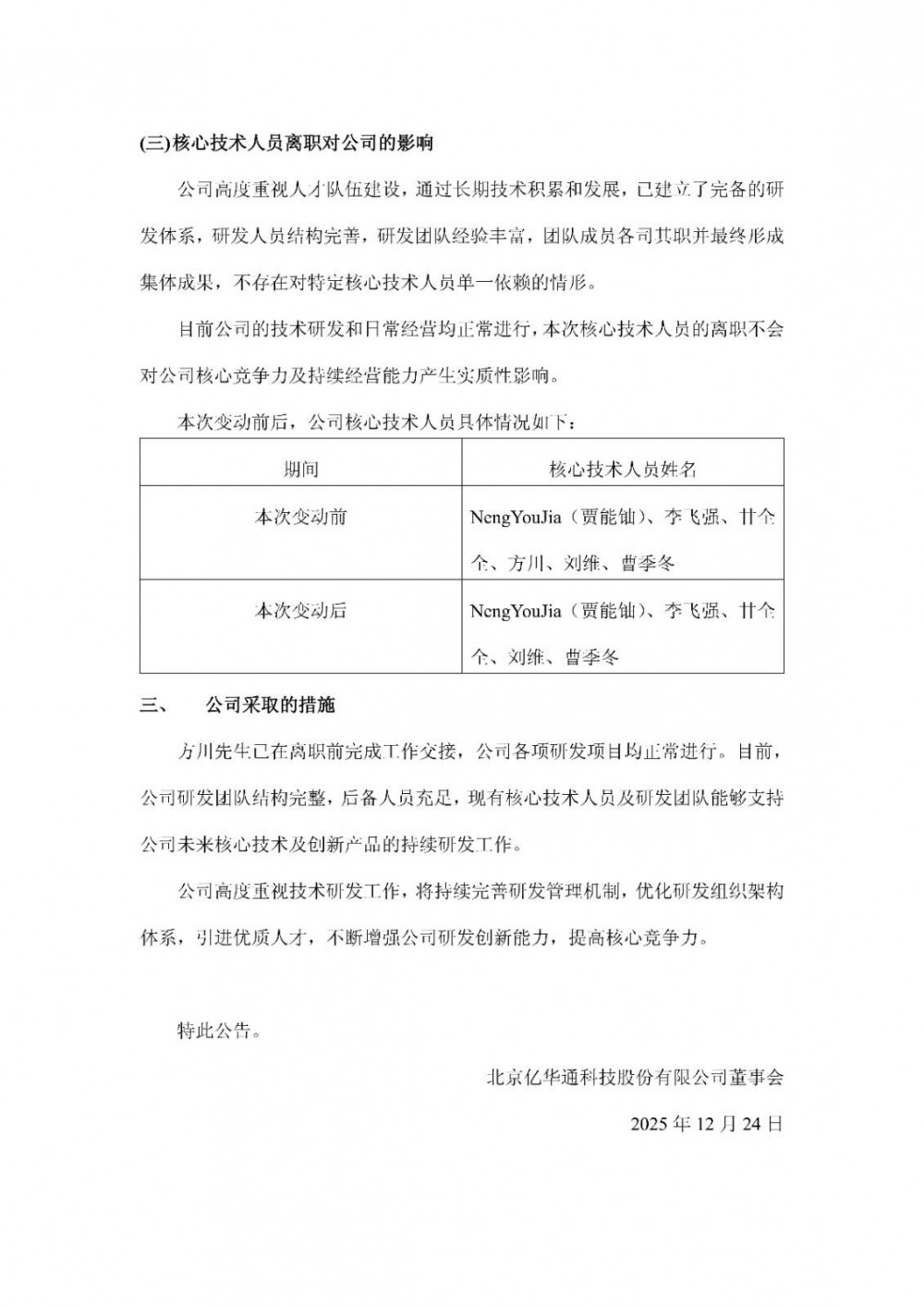 亿华通表示,方川先生离职后,其负责的研发工作已完成交接,公司的技术研发和日常经营均正常进行,方川先生的离职不会对公司的技术研发、核心竞争力和持续经营能力产生实质性影响。