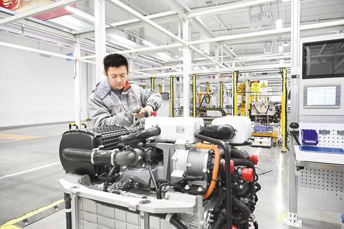 1月7日,在北京亿华通科技股份有限公司张家口生产基地,工人正在组装氢燃料电池发动机。 本报记者 郭晓通摄□本报记者 郭晓通 李