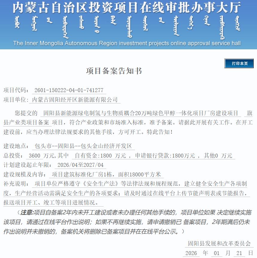 1月21日,固阳县新能源绿电制氢与生物质耦合20万吨绿色甲醇一体化项目厂房建设项目获备案。