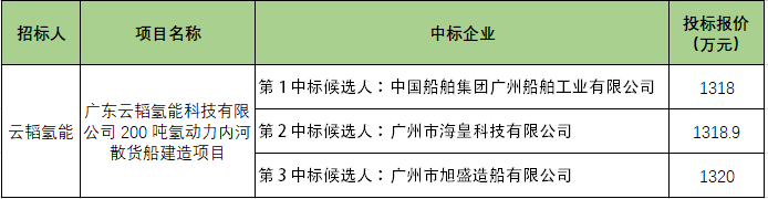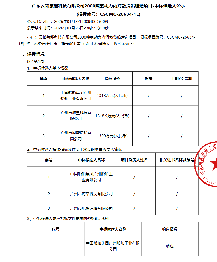 1月22日,广东云韬氢能科技有限公司2000吨氢动力内河散货船建造项目-中标候选人公示。