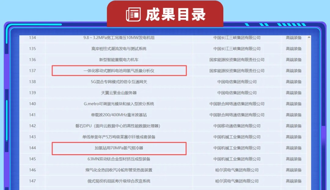 其中氢能共5项技术上榜,具体包括氢燃料电池用氢气流量控制阀组、兆瓦级PEM电解制氢装备用氧化铱催化剂、一体化移动式燃料电池用氢气质量分析仪、加氢站用70MPa氢气预冷器、生物质沼气一步法制绿氢工艺及装备