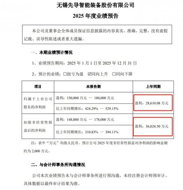 1月26日,先导智能发布2025年度业绩预告,预计2025年实现归属于上市公司股东的净利润15亿元-18亿元,同比增长424.29%-529.15%;预计扣除非经常性损益后的净利润为14.80亿元-17.80亿元,同比增长310.83%-394.11%。