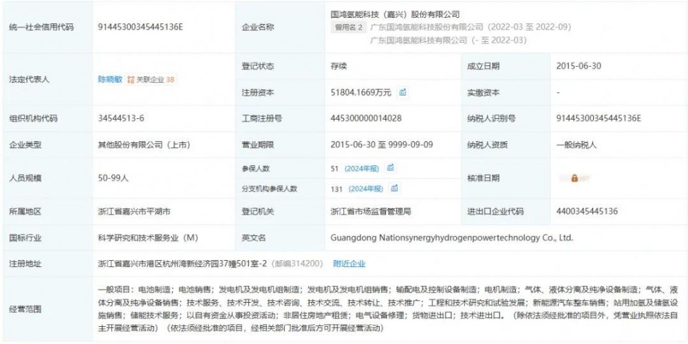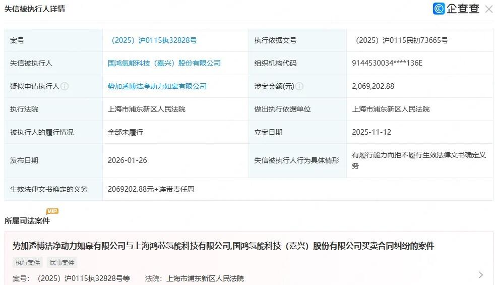 1月26日,信用中国显示,国鸿氢能科技(嘉兴)股份有限公司(简称“国鸿氢能”)被列入失信被执行人。根据《上海市浦东新区人民