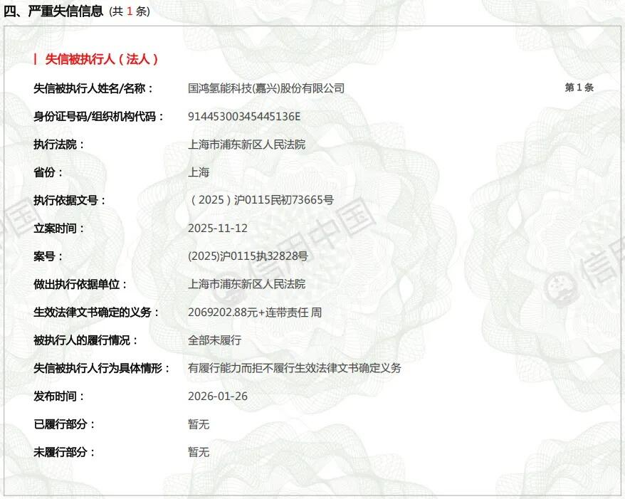 1月26日,信用中国显示,国鸿氢能科技(嘉兴)股份有限公司(简称“国鸿氢能”)被列入失信被执行人。