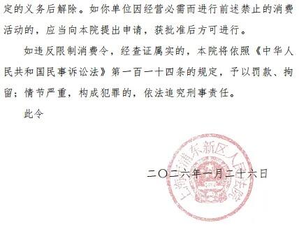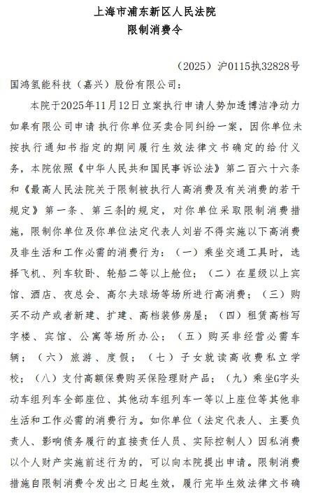 根据《上海市浦东新区人民法院限制消费令》,对国鸿氢能科技(嘉兴)股份有限公司采取限制消费措施,限制单位及单位法定代表人刘岩不得实施高消费及非生活和工作必需的消费行为。