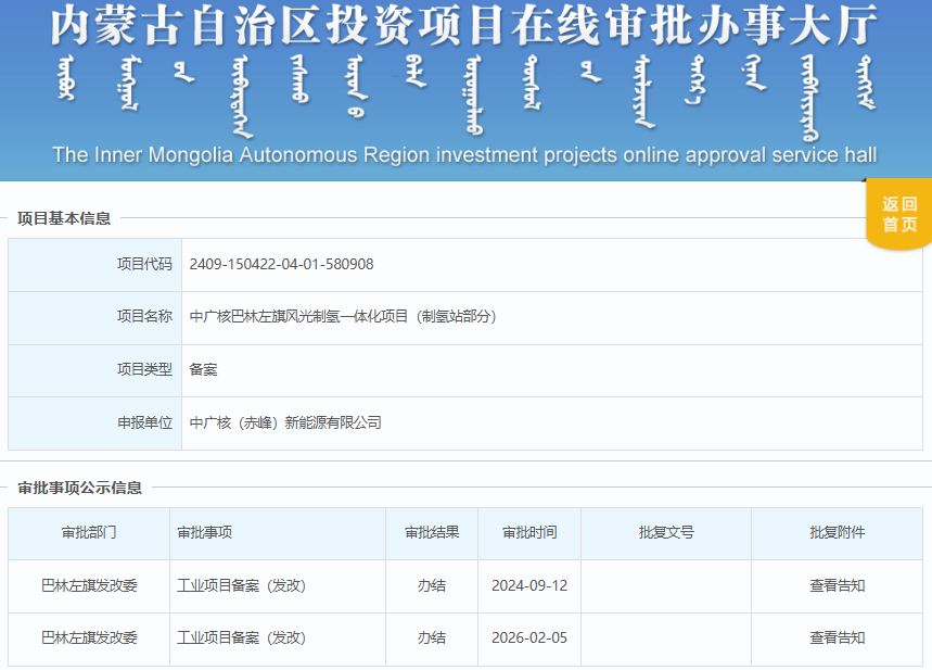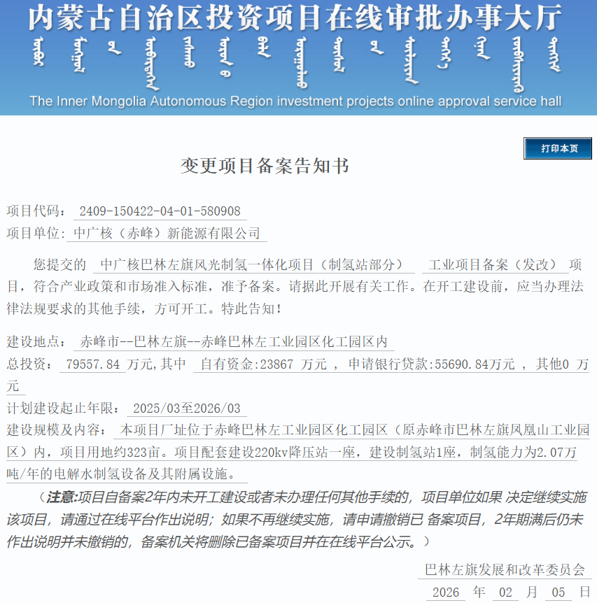 2月5日,中广核巴林左旗风光制氢一体化项目(制氢站部分)变更获备案。