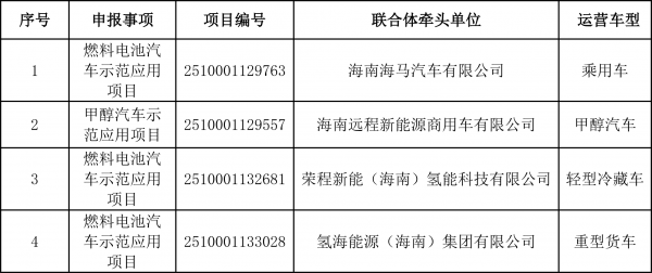 根据《关于开展海南省燃料电池汽车等技术示范应用项目第二批(2025—2026年)申报工作的通知》(琼工信汽车〔2025〕316号)有关要求,经企业联合体自愿申报、市县工信主管部门推荐、专家评审和公示等程序,确定海南海马汽车有限公司为牵头单位的4个项目入围海南省第二批(2025—2026年)燃料电池汽车等技术示范应用项目(见下表),现予以公布。
