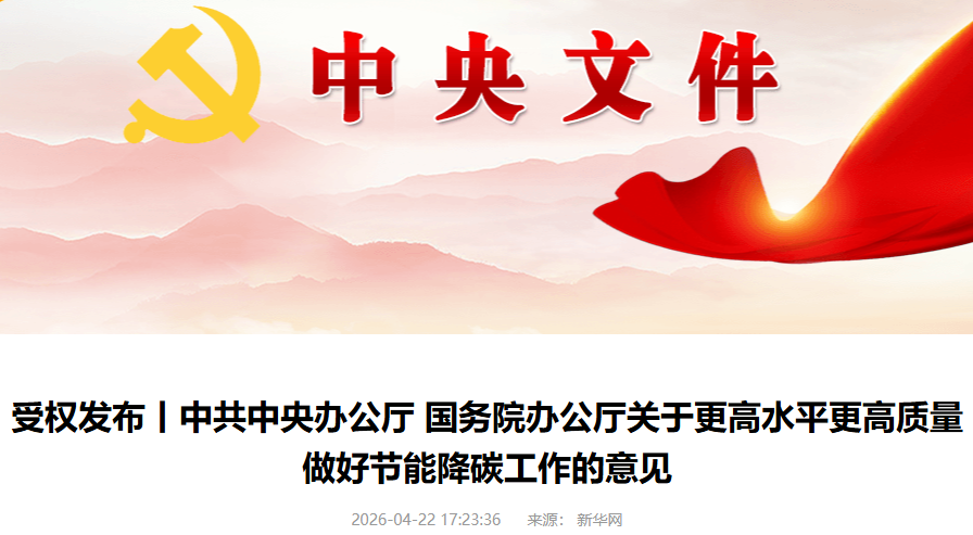 4月22日,中共中央办公厅 国务院办公厅关于更高水平更高质量做好节能降碳工作的意见。