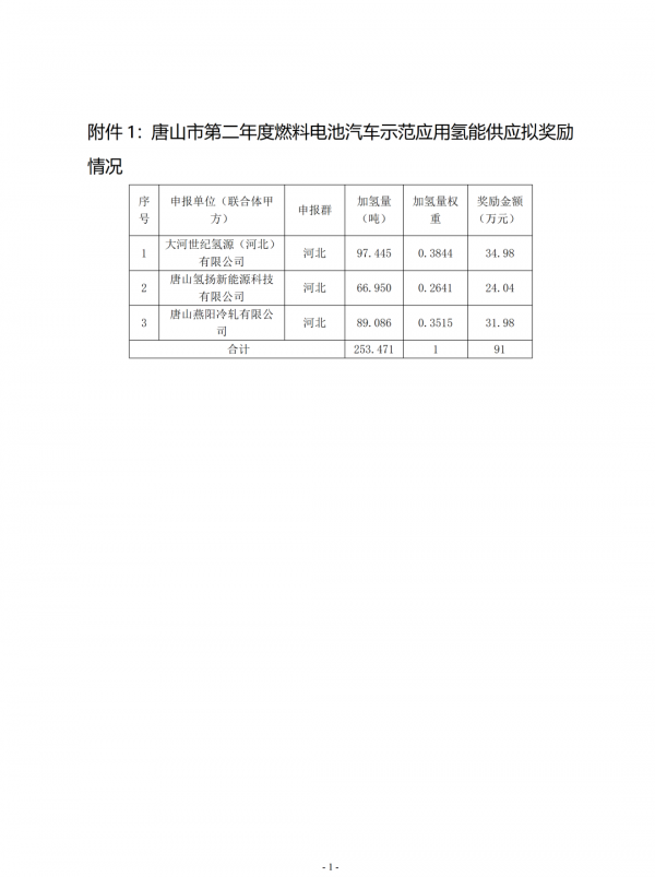 4月21日,唐山市工业和信息化局公示唐山市第二年度燃料电池汽车示范应用氢能奖补资金和第三年度燃料电池汽车示范应用奖补资金分