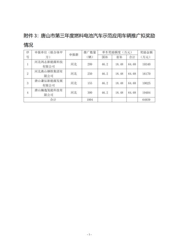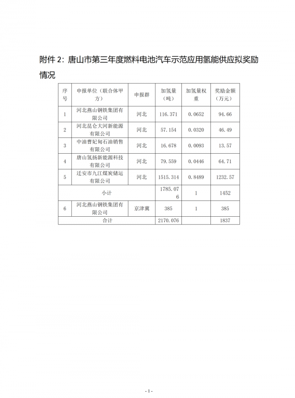 关于唐山市第二年度燃料电池汽车示范应用氢能奖补资金和第三年度燃料电池汽车示范应用奖补资金分配计划的公示