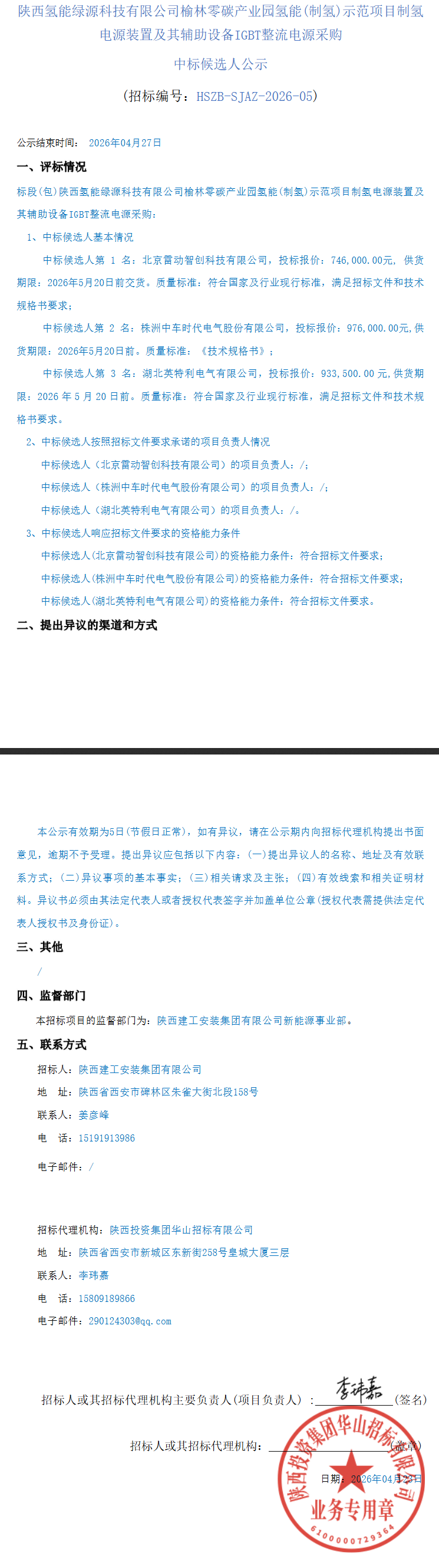 4月23日,陕西氢能绿源科技有限公司榆林零碳产业园氢能(制氢)示范项目制氢电源装置及其辅助设备IGBT整流电源采购中标候选人公示