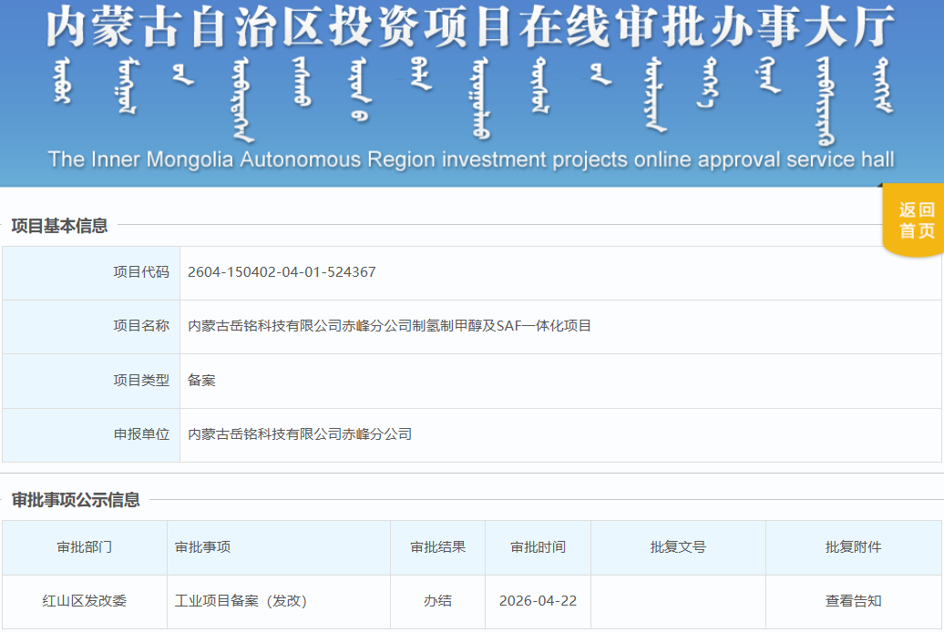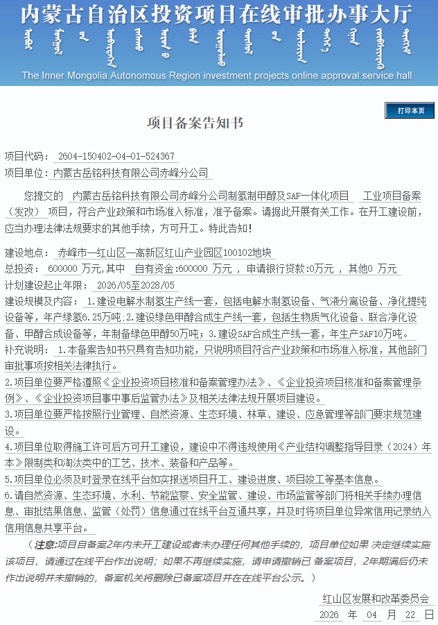 4月22日,内蒙古岳铭科技有限公司赤峰分公司制氢制甲醇及SAF一体化项目获备案。