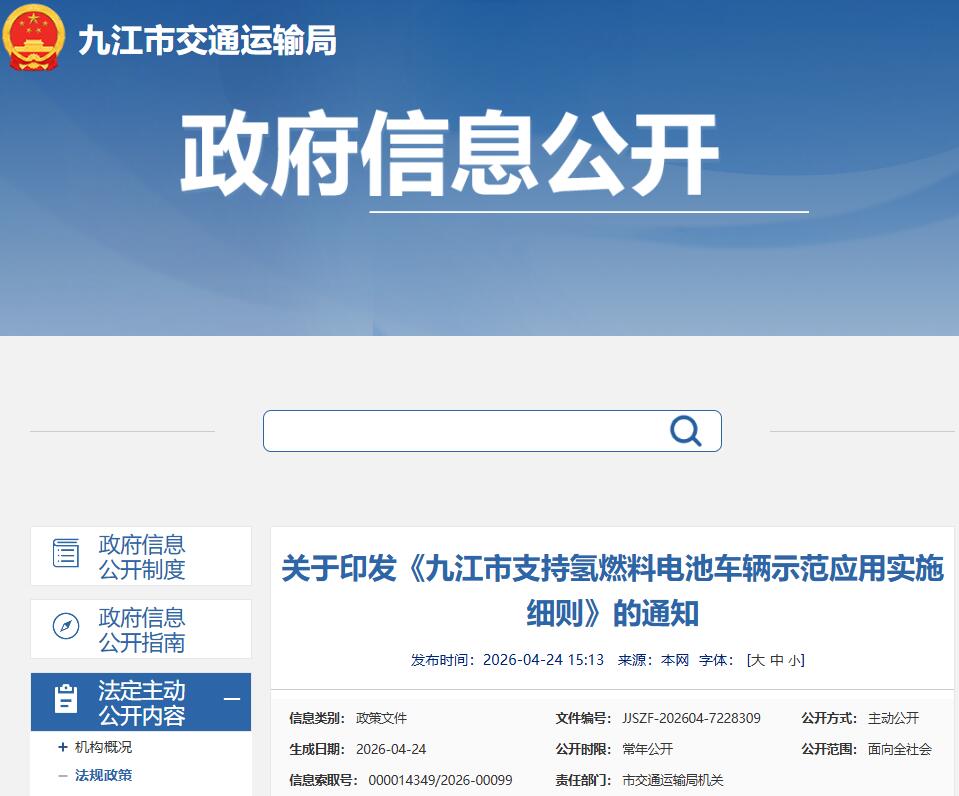 近日,九江市交通运输局关于印发《九江市支持氢燃料电池车辆示范应用实施细则》的通知。