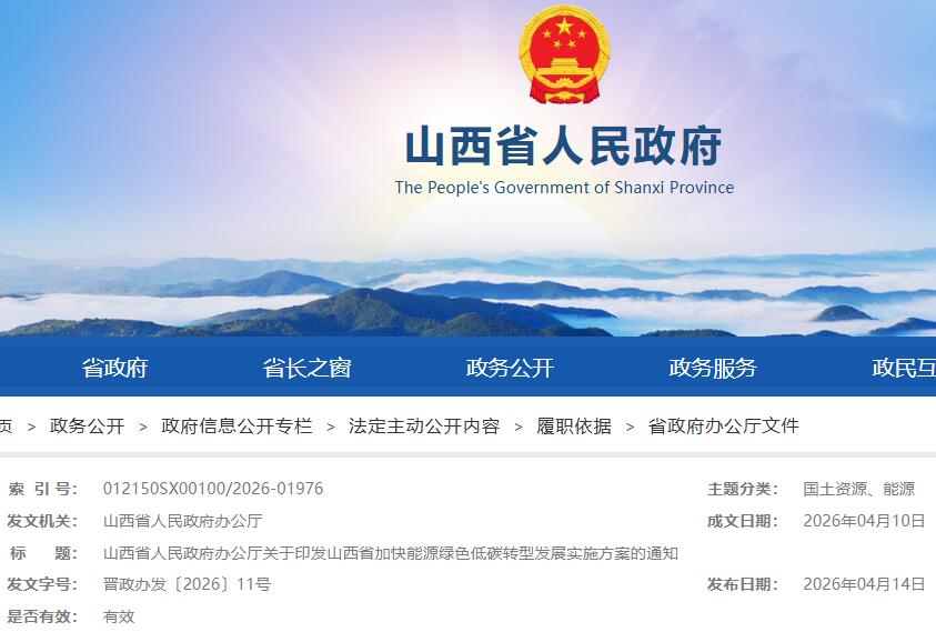 近日,山西省人民政府办公厅关于印发山西省加快能源绿色低碳转型发展实施方案的通知。