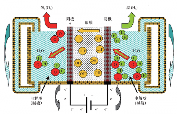 在这部分中,碱性电解是最成熟和最常用的。它由两个电极——阳极和阴极——组成,中间有一个多孔隔膜。周围是碱性溶液。通电后,水分子在带负电的阴极处分解并释放氢气。这是一种低温技术,通常在50–80°C下运行。虽然成本低,但对使用可再生能源所带来的功率波动的耐受性较差。
