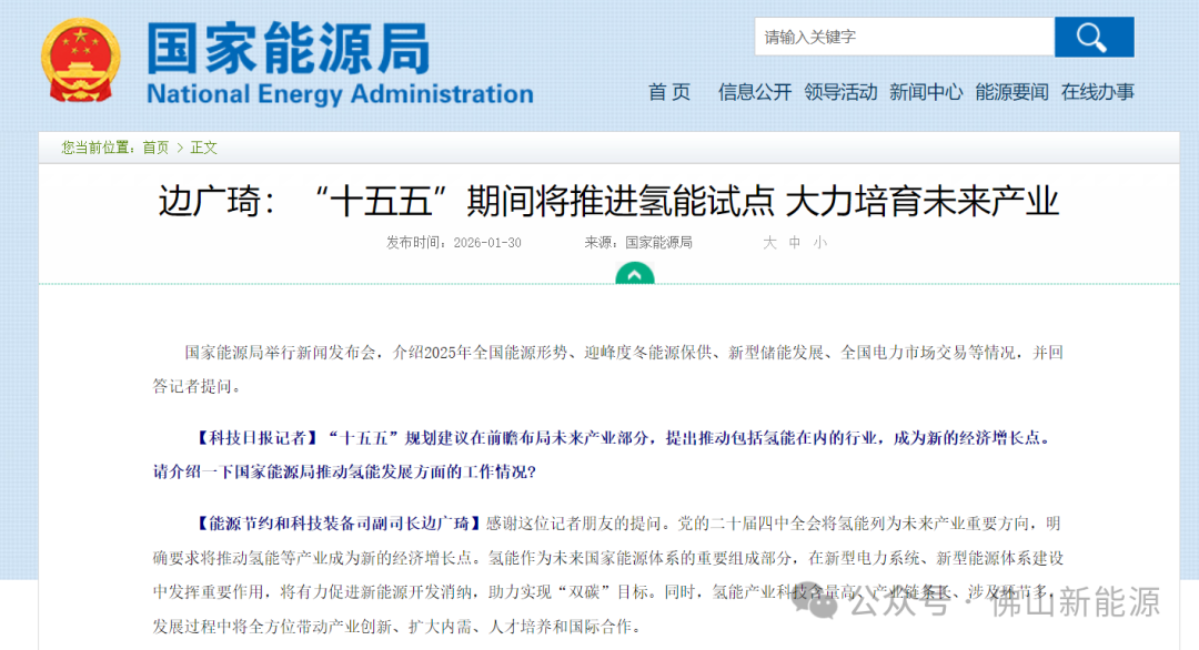针对媒体提出的“十五五'规划建议在前瞻布局未来产业部分,提出推动包括氢能在内的行业,成为新的经济增长点。请介绍一下国家能源局推动氢能发展方面的工作情况?”问题,能源节约和科技装备司副司长边广琦回答:党的二十届四中全会将氢能列为未来产业重要方向,明确要求将推动氢能等产业成为新的经济增长点。氢能作为未来国家能源体系的重要组成部分,在新型电力系统、新型能源体系建设中发挥重要作用,将有力促进新能源开发消纳,助力实现“双碳”目标。同时,氢能产业科技含量高、产业链条长、涉及环节多,发展过程中将全方位带动产业创新、扩大内需、人才培养和国际合作。